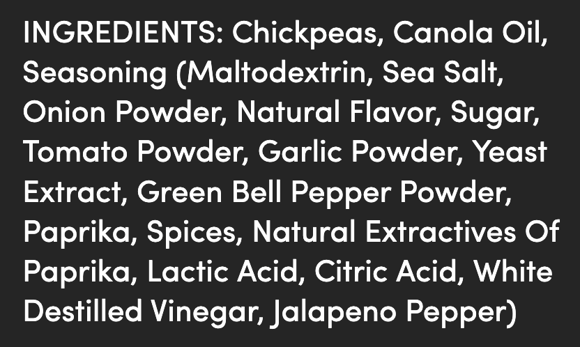 Chickpeas, Canola Oil, Seasoning (Maltodextrin, Sea Salt, Onion Powder, Natural Flavor, Sugar, Tomato Powder, Garlic Powder, Yeast Extract, Green Bell Pepper Powder, Paprika, Spices, Natural Extractives Of Paprika, Lactic Acid, Citric Acid, White Destilled Vinegar, Jalapeno Pepper)